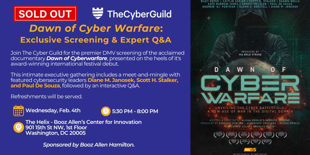 Join The Cyber Guild for the premier DMV screening of the acclaimed documentary Dawn of Cyberwarfare, presented on the heels of it’s award-winning international festival debut. This intimate executive gathering includes a meet-and-mingle with featured cybersecurity leaders Diane M. Janosek, Scott H. Stalker, and Paul De Souza, followed by an interactive Q&A. Refreshments will be […]